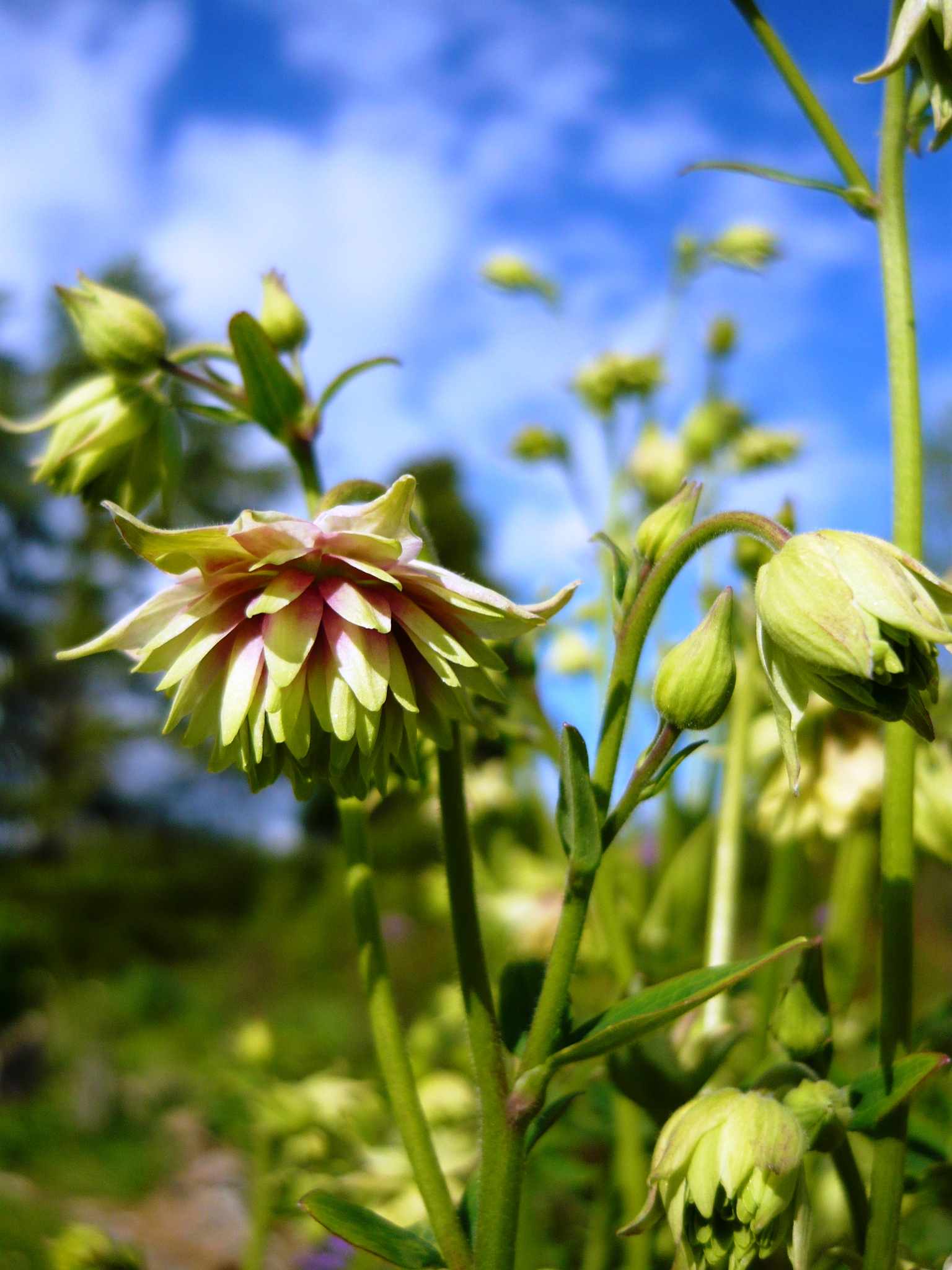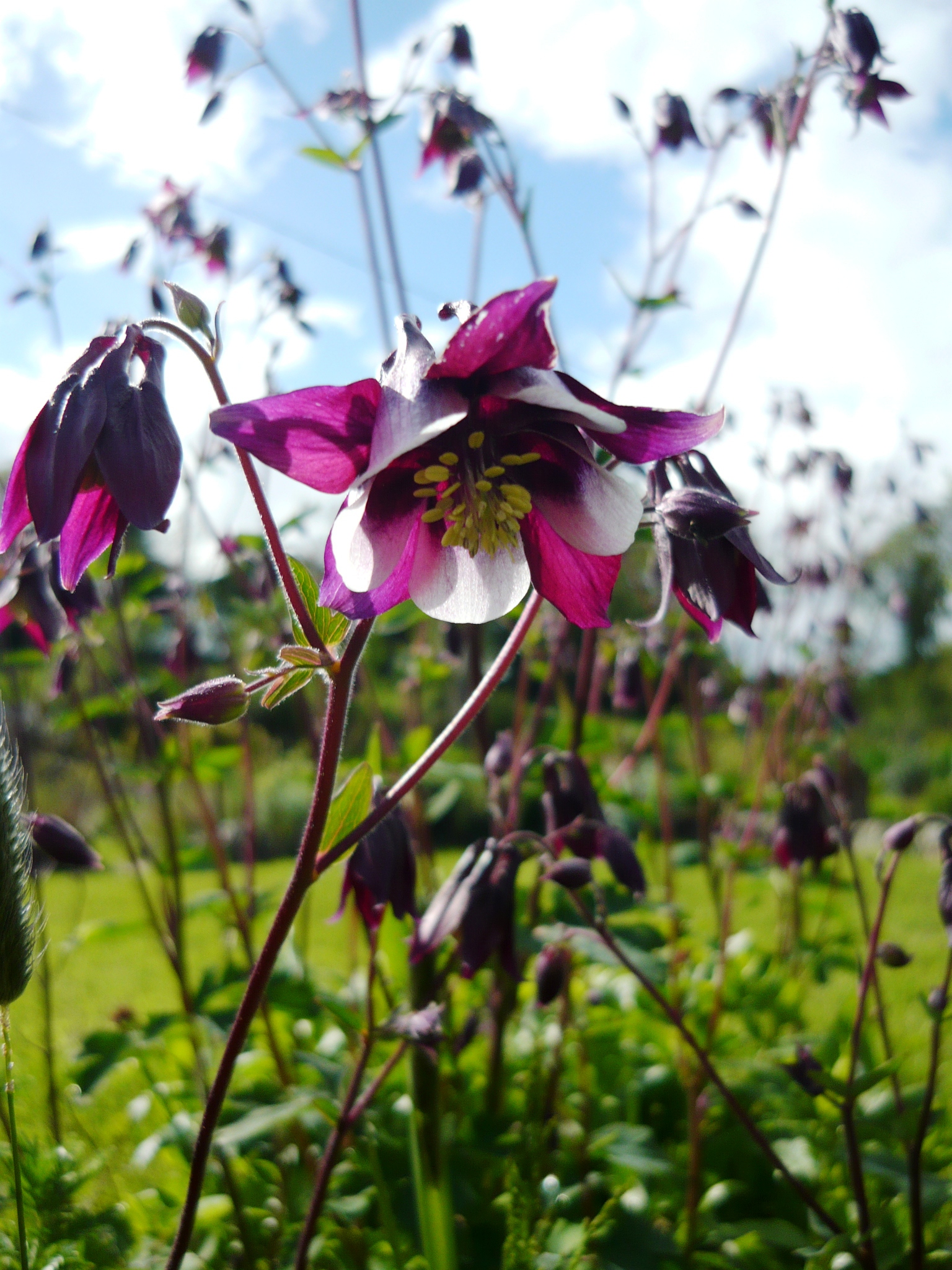 We always write a bit about what is going on around the circle and garden once a month and all of these posts can be found in the category, Elemental circle. As you can see on the following photos our circle has a lot of lush green growth, but not that many flowers yet. We are happy to look at the Aquilegias though, that we grew from seeds two years ago. The dark one is called William Guinness and the green and pink one is the lovely Nora Barlow.