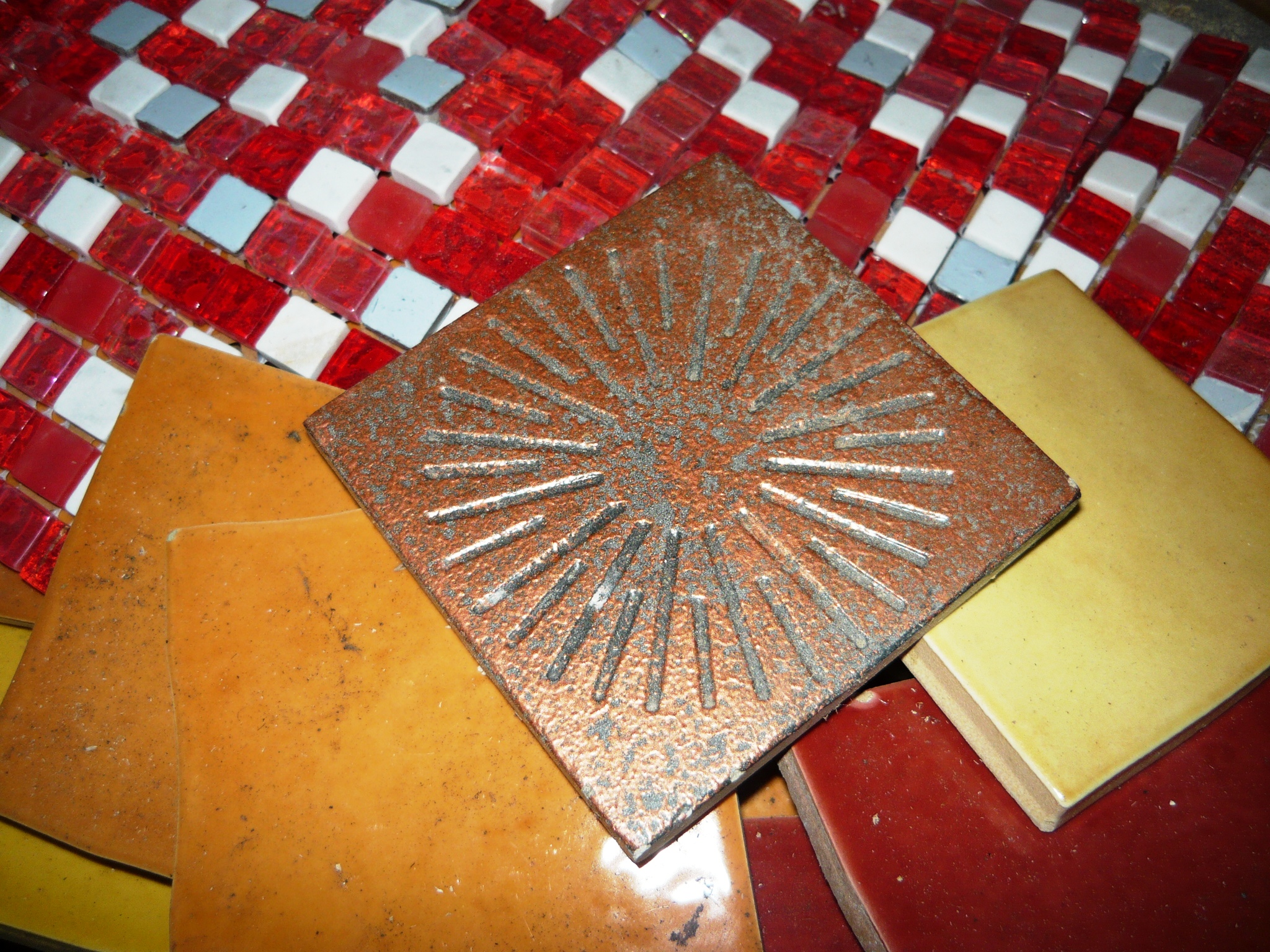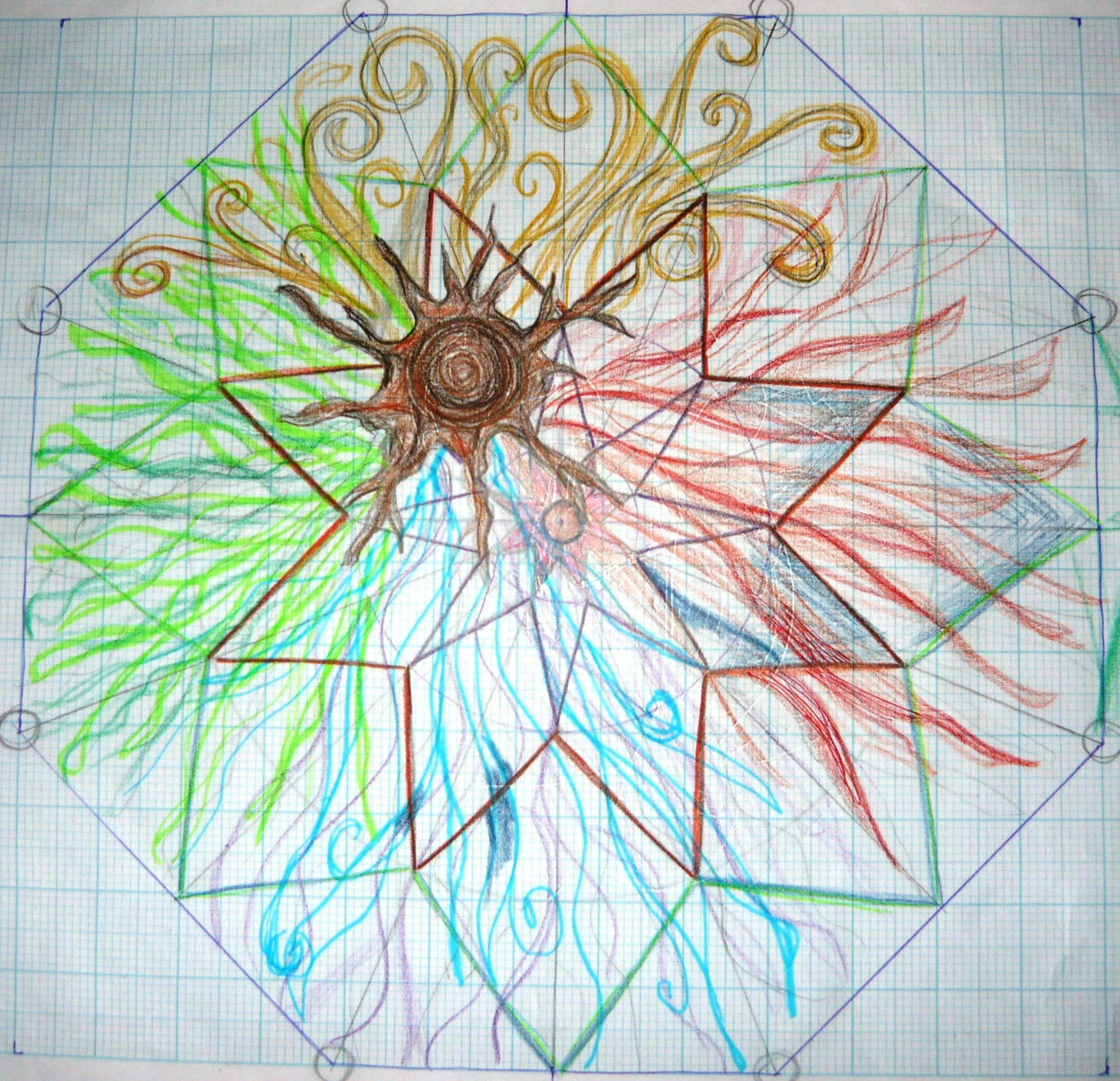 Our star will start in the middle of the room, but the colours of the elements will come streaming out from the tree, slightly off centre. They will start off thin and become thicker as they come closer to the outside walls. The star will go from light close to the middle to dark close to the walls. This will enable us to use all our different tiles. We still have a couple of weeks work to do, finishing of the walls and exterior but we are hoping to start the mosaic floor in the middle of June. It will be a big project but should be pretty straight forward and a lot of fun. We will tell you all about how we get on at a later date. Below is a detail from our first sketch.