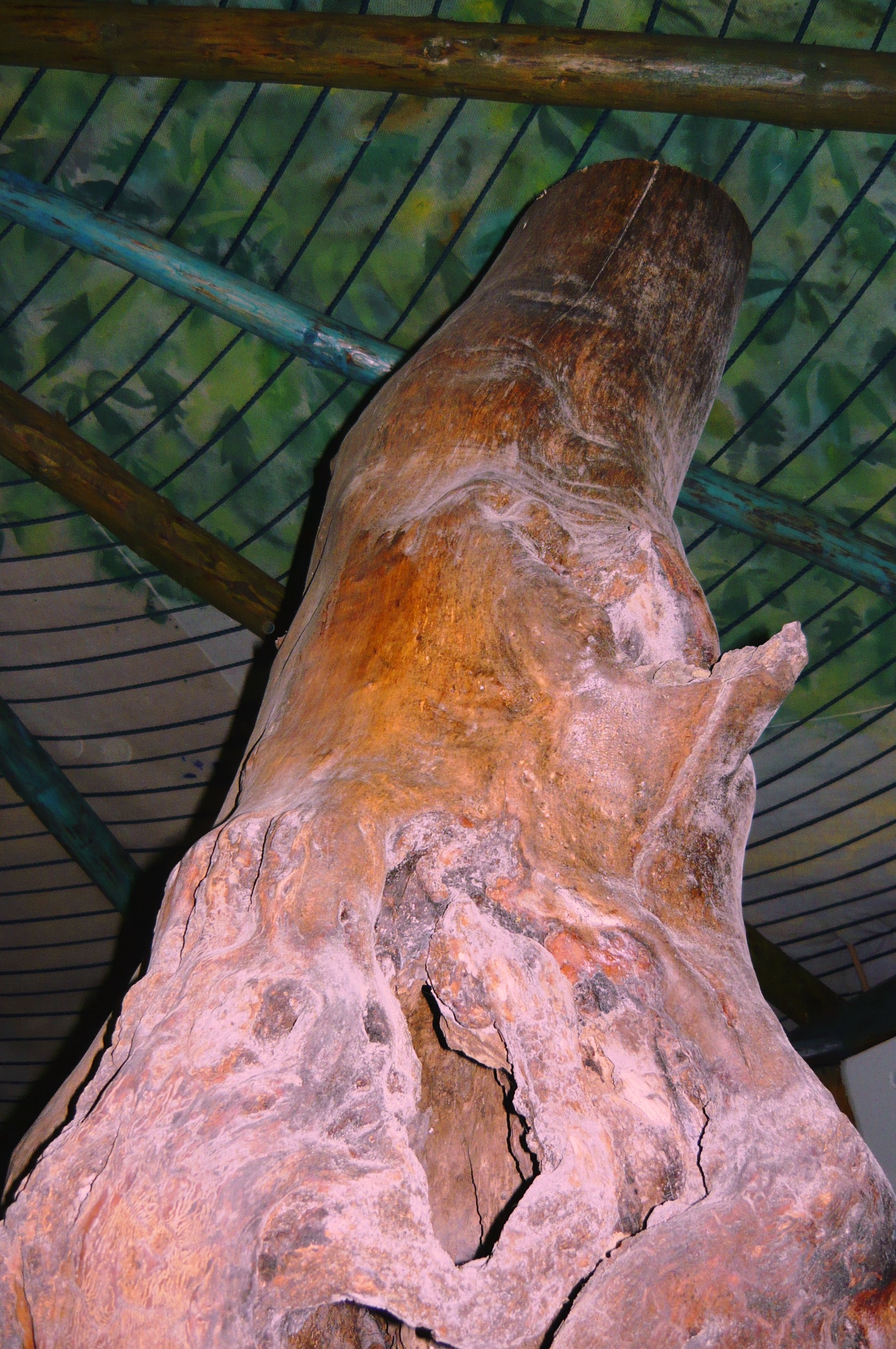 We have been collecting tiles from skips and friends for a couple of years and now we have enough for the 40 square meter floor area and hopefully enough of each colour to complete the design. We will start by tiling roots coming out from our big tree trunk, stretching in all directions. The aim is to make it look like the tree is growing straight out of the floor. It is a very old hollow, gnarled ash that we have de-barked, treated with wood preserver and drenched in linseed oil to bring out its beauty. It is a bit dusty at moment due to all the work going on around it, but when the floor is finished we will clean it up and add a large cascading plant on top of it. You can’t see it clearly in the picture but it is quite a distance from the top of the tree to the ceiling.