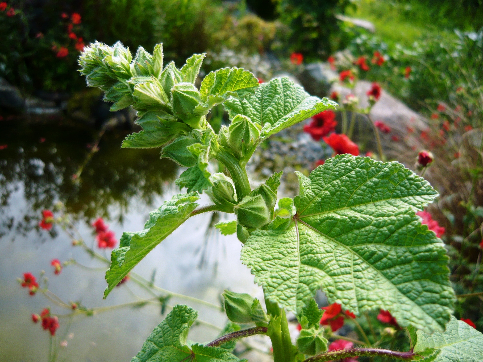 There is a lovely anticipation in the garden this time of year. So many different flowers are still to open their buds, like these hollyhocks, growing close to our smaller pond. We look forward to sharing them next month.