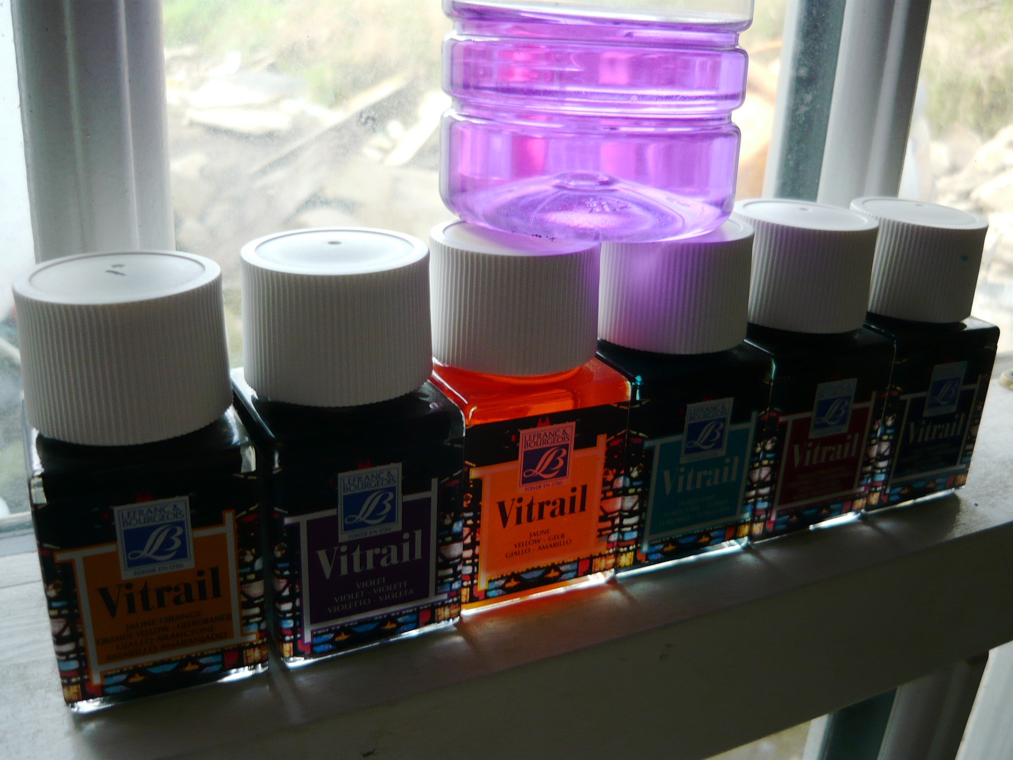 After this the walls looked nice but something was still missing. We wanted more colour. Most people admire multicoloured stained glass windows and we wanted to recreate something of that feeling in our build. Finding coloured bottles is quite difficult and there is only so much Swedish raspberry vodka one can drink to get red bottles. We went out and bought some glass paints.