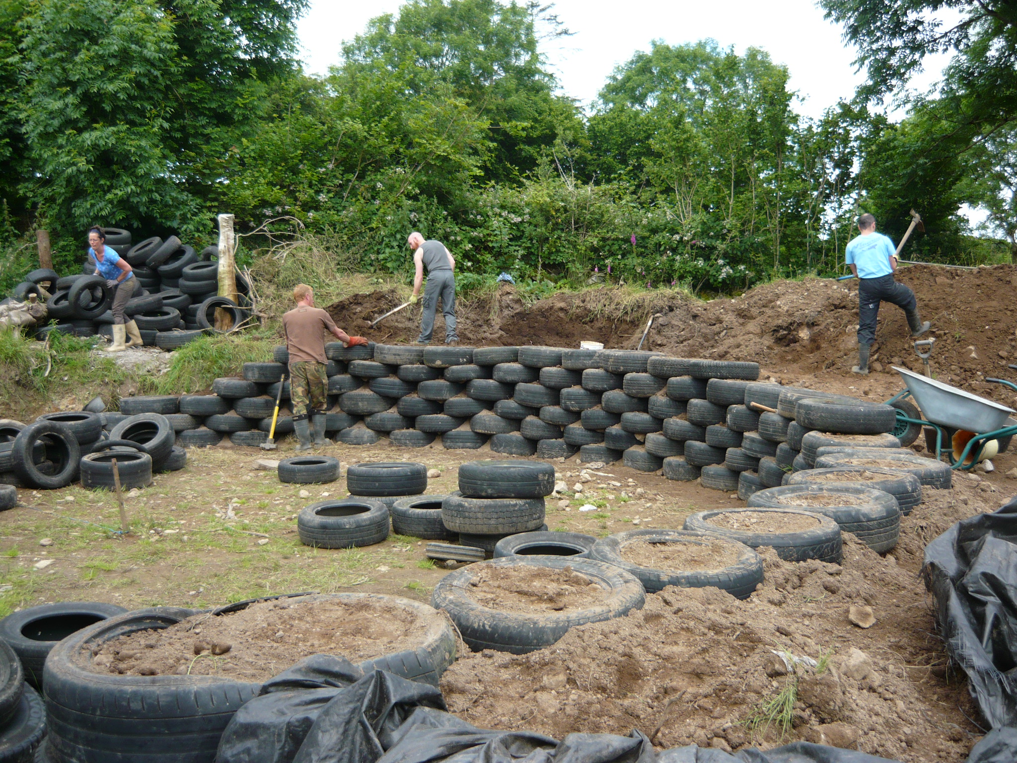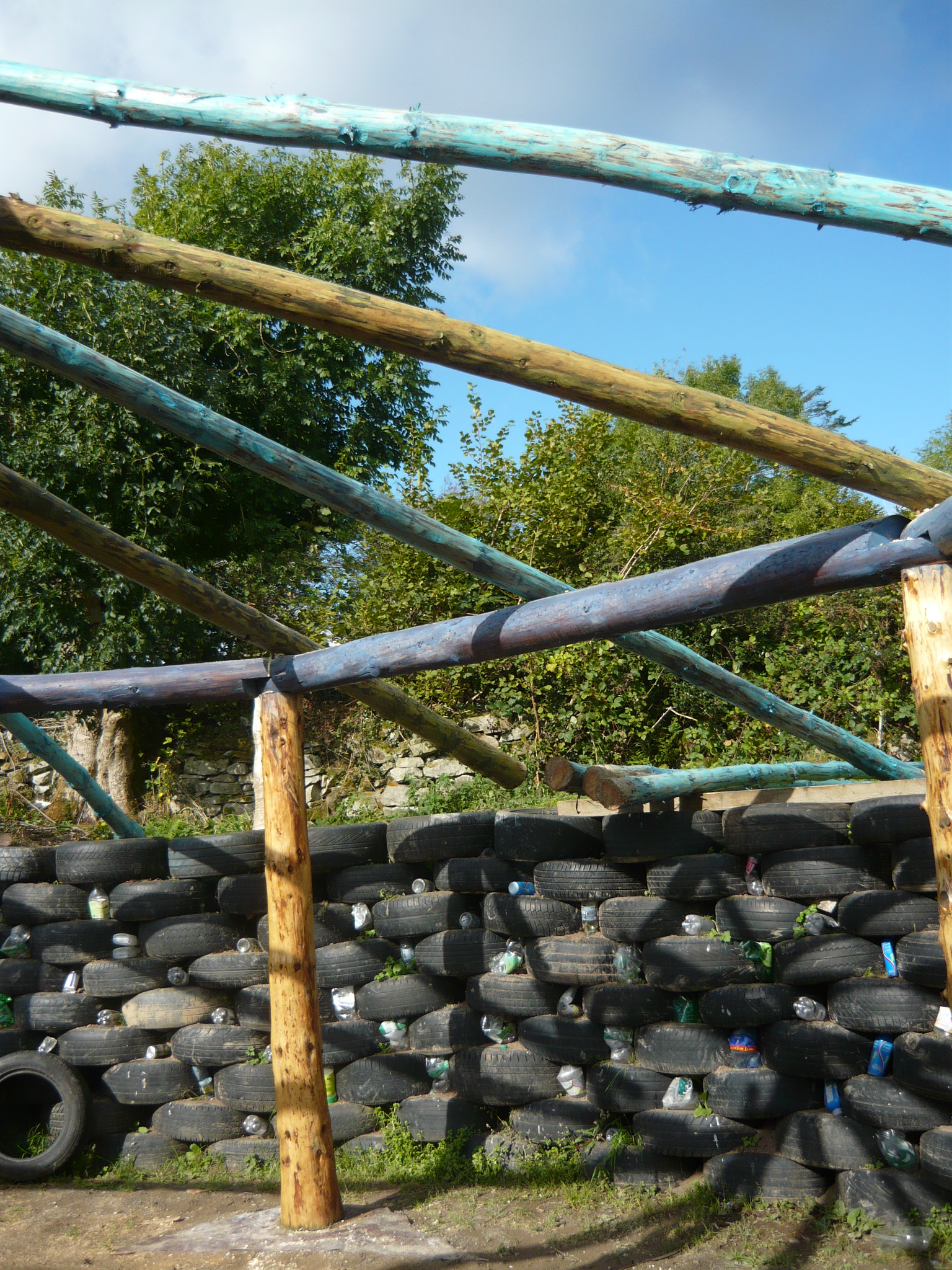 We built frames out of 4” by 2” timber as you can see in the picture. We added crosspieces ever so often to stabilize the wall and make each bottle wall section into a manageable size. The construction was easy, we started by putting on two rows of cement mortar, with some insulation in the middle and put down our first row of bottles. Any old jars, small bottles and glasses can be used. If you want to use wine bottles, you need to score and cut them first with a glass cutter. Sometime it works to put a jar on top of a bottle and sometimes you need to put two jars together. We made up a bottle brick out of two cut wine bottles, and used it as a measure when we constructed all our bricks. For sealing the bottle bricks we used brown parcel tape and duct tape. When our first row was down, we put on more cement mortar, some insulation in the middle and more bricks, staggered in relation to the first row. It is very important to add small nails into the timber on the sides and into all the cross pieces to hold the cement mortar. We kept building in this manner, filling each section with bottle bricks.