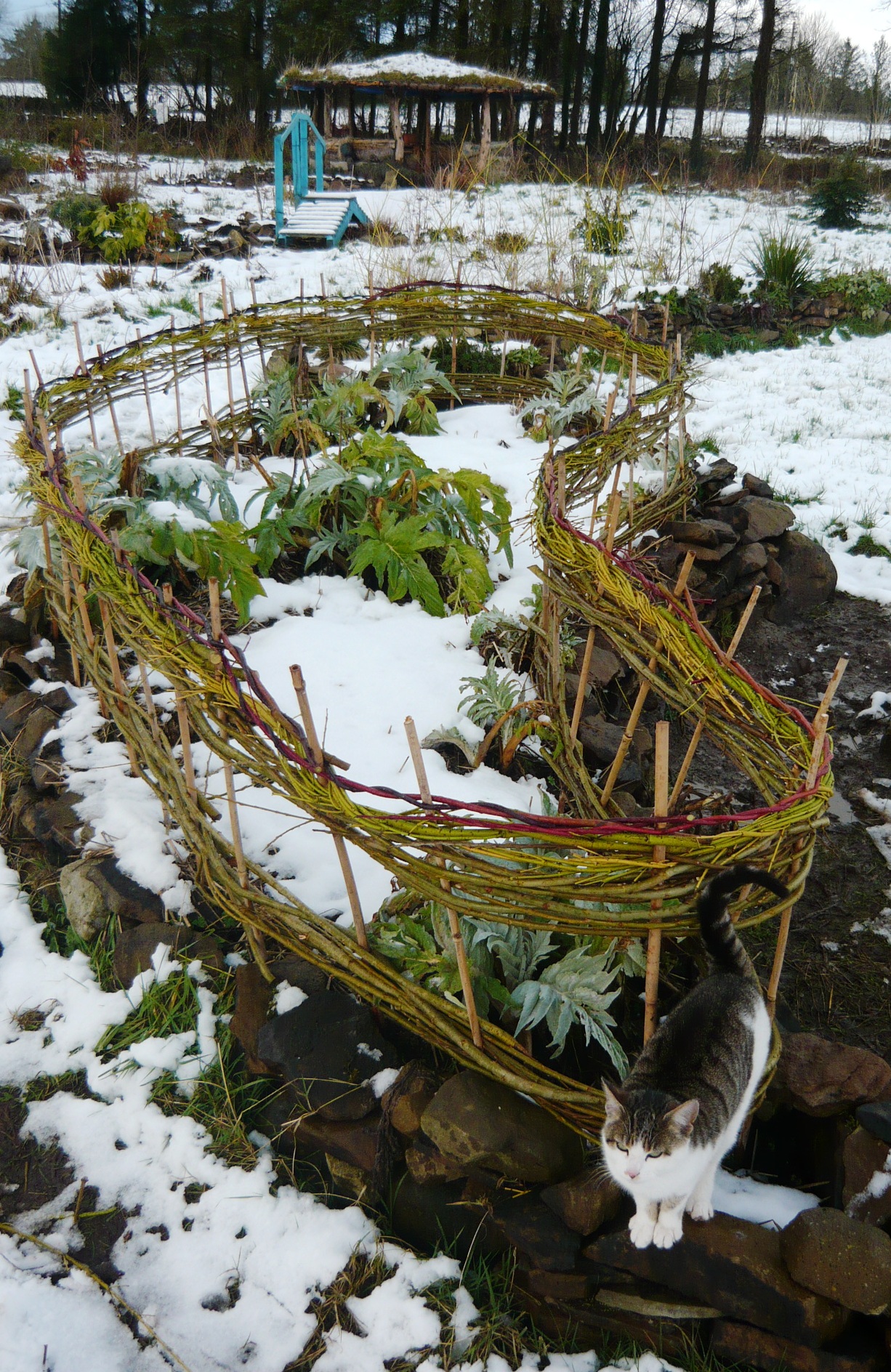 It is that time of year again when a lot of Willows and Dogwoods need pruning. As we like to use as many natural and local materials as possible, we decided to use the prunings to make plant-supports. Our Artichokes and Cardoons grew very big last year and some of them blew over on a windy day. So a low, strong fence to go around the bed was on our wish list. As we wanted it to last for more than one year, we used Bamboo canes as the uprights. Last year we made a few supports and used willow for the uprights, but even turned upside down, they rooted and had to be moved in the autumn. We put the uprights in quite close, about 20 centimeters apart. You need an uneven number of uprights. We then wove long straight Willow rods round and round for about 8 centimeters, left a space and wove another section higher up.