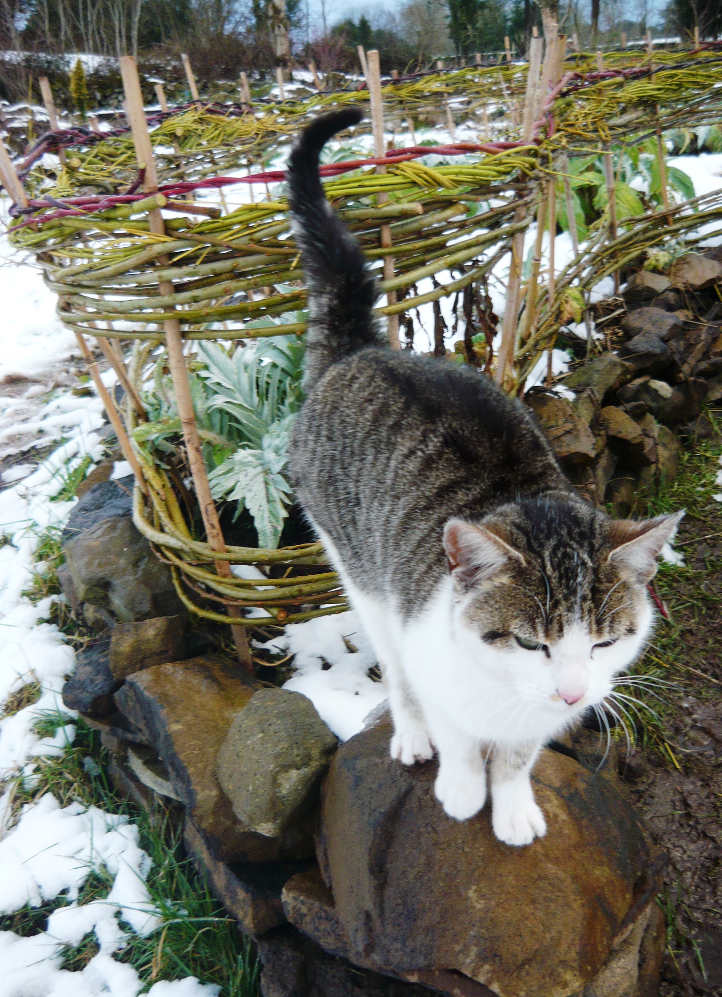 Our living willow fence by the pond is just over a year old now and had grown a lot of strong upright shoots that needed weaving in. It only took one of us about an hour to do this and we are very happy with the result. Every year it will grow thicker and stronger but it is already strong enough for the cat to walk along!