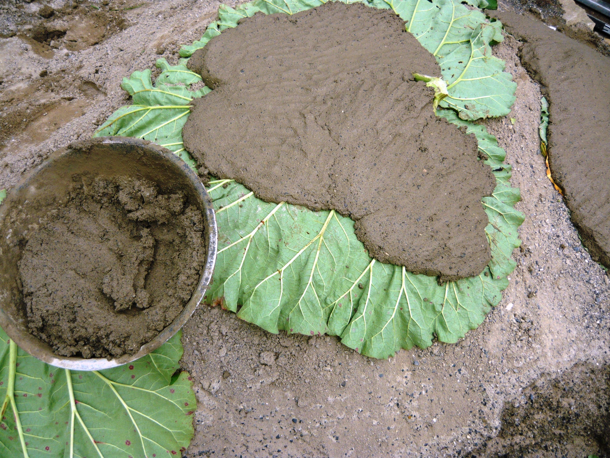 We saw some rhubarb leaf casts at a friend’s place in Sweden recently and wanted to try making our own and use them as bird baths. We used eco-cement, water and sand for our mix and added a little water-proofer to make water tight birdbaths.