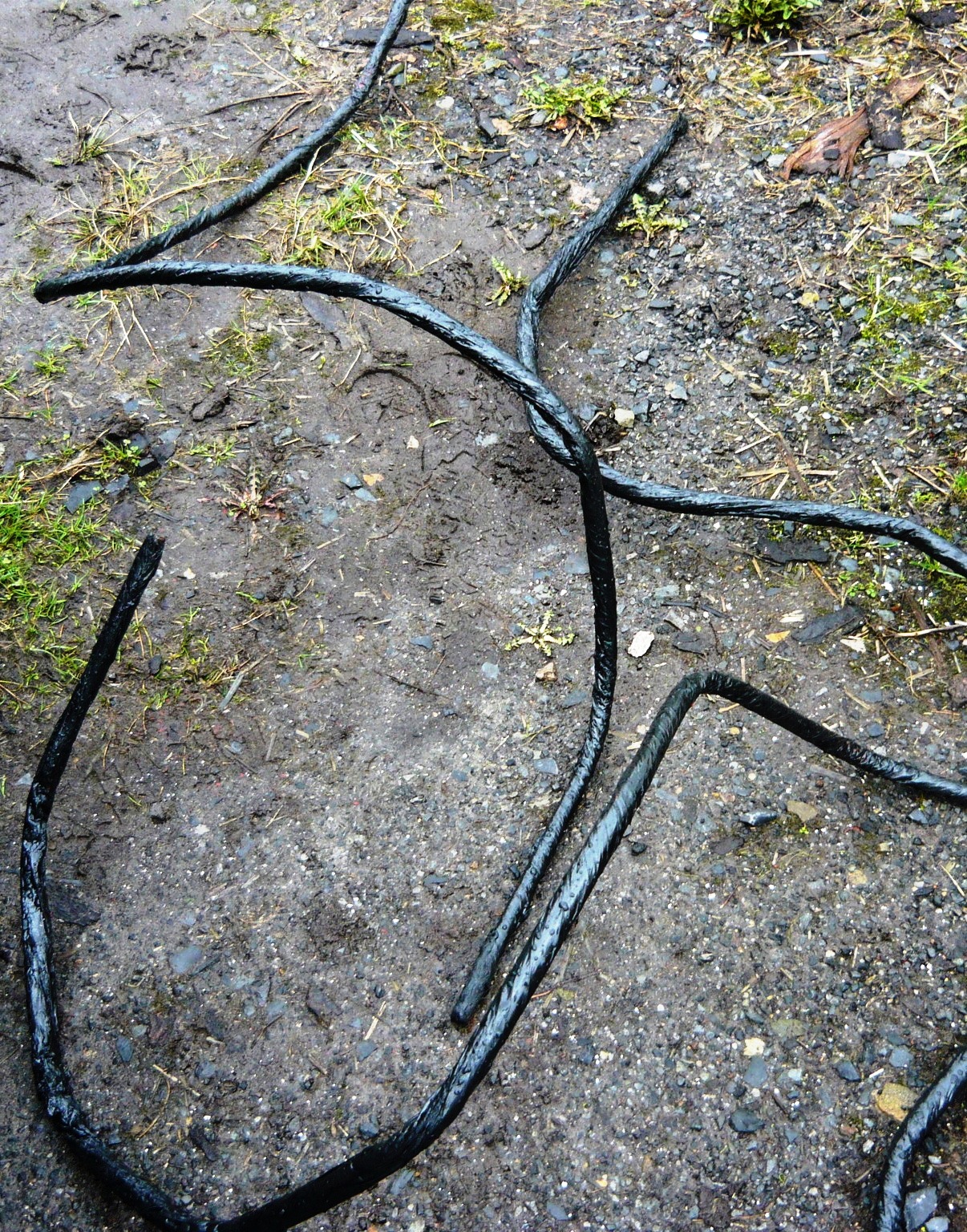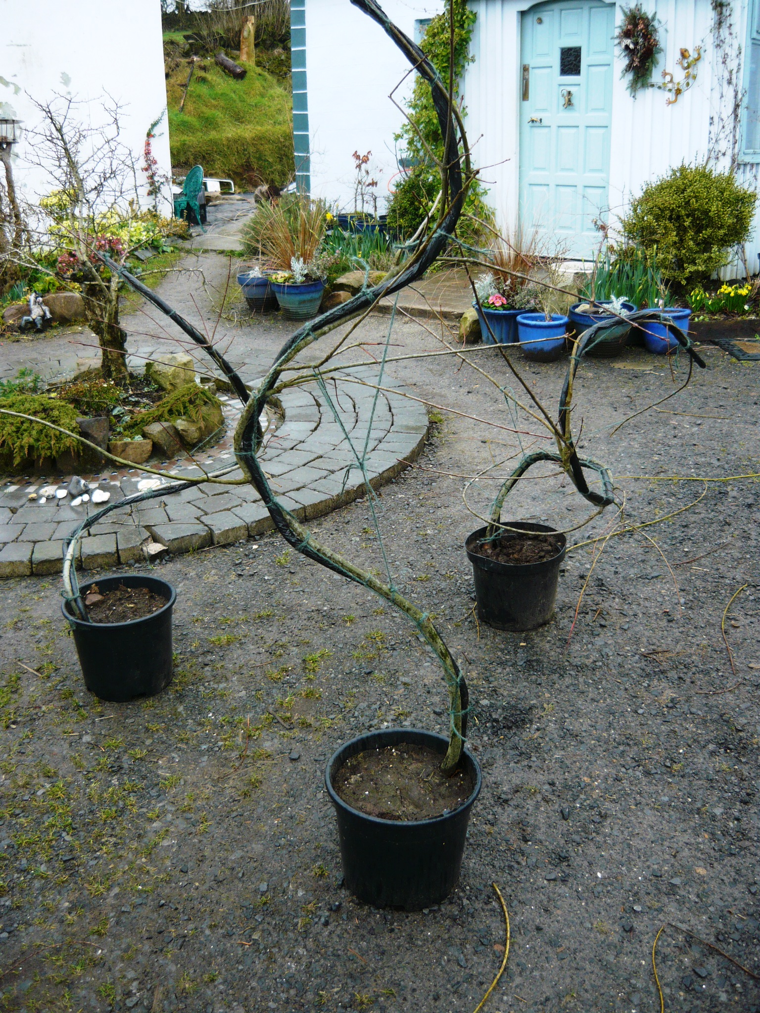 This year we decided to try something a little different outdoors and bent some reinforcement-bars into nice curves. We acquired some bare root red oaks that we potted up in November last year and in February it was time to have some fun with them. The re-bars were anchored deep in the pots and the stems of the trees bent and tied to the re-bars with twine. We will leave the re-bars on for a year or two and then remove them. The stems will stay in their positions and have a very unusual appearance. They put on a lot of growth over the summer and we think they look quite lovely now. This is a very cheap and easy way to get a special feature in your garden. Many different varieties of trees can be treated like this.