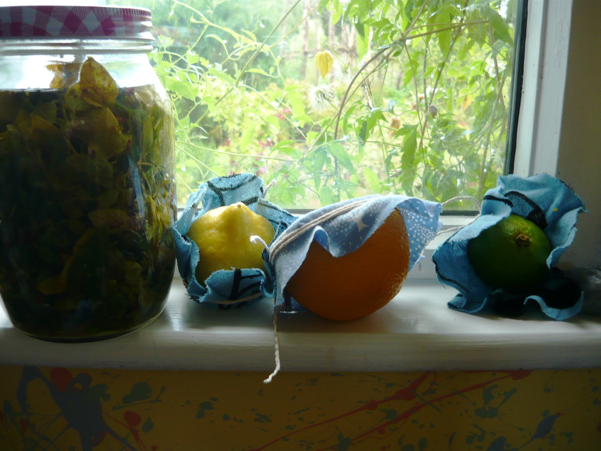 We mixed some ordinary table salt with some lovely sea salt and some Himalayan pink salt and put it in two different bowls. To the one for oranges we added lavender flowers from the garden, ylang-ylang, lavender and mandarin essential oils and to the one for lemons and limes we added chopped rosemary and clove, peppermint and rosemary essential oils. You could also add other herbs and your favourite spices to the mix. We then stirred for a good while to mix the oils and herbs well with the salt and packed our peels full of the mixture. To finish off we added fabric circles and string to keep the air-fresheners all together. This was quite fiddly to do but putting an elastic band around the fabric as you tie the string on helps a lot. We now have a sweet-smelling house with every room scented for very little money.